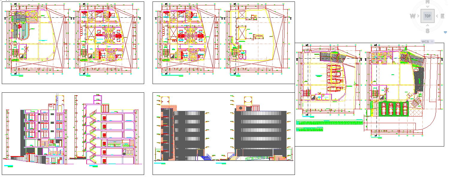 Commercial Building in Hotel DWG, Commercial Building in Hotel Download file, Commercial Building in Hotel Design. This hotel design in round shape.layout plan of all floor, bedrooms, restaurant, dining area, section plan elevation design, furniture plan and vehicle parking of Tourist Hotel plan.