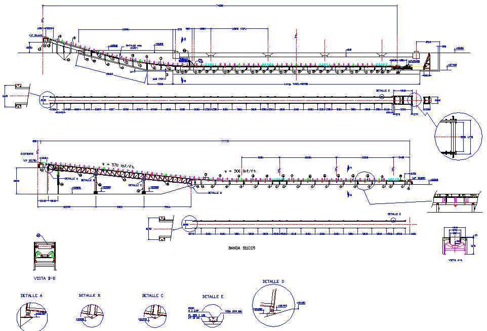 Conveyor system plan detail, dimension detail, naming detail, section line detail, centre line detail, etc.