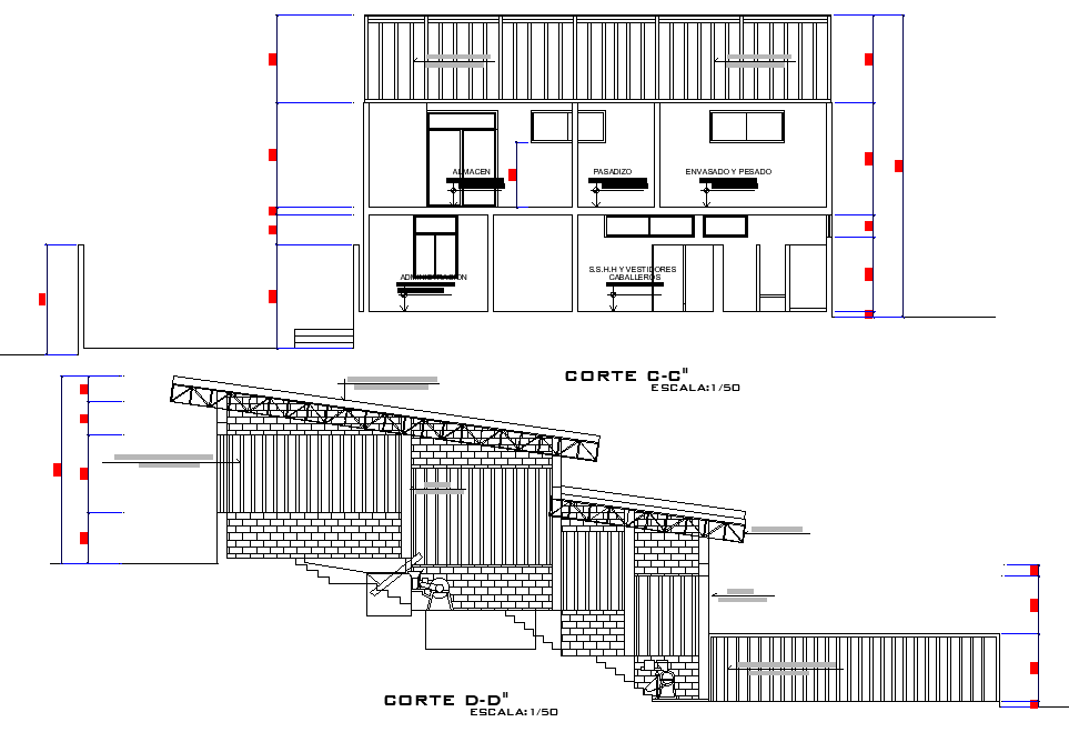 Detail of section Coffee processing plant, section C-C’ detail, section D-D’ detail, dimension detail, naming detail, etc.