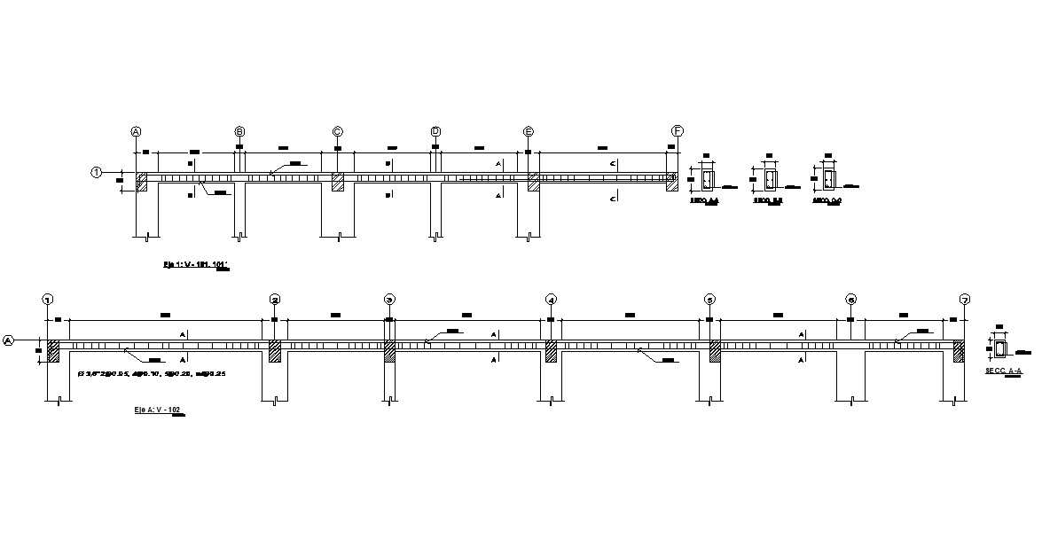Beam section detail, centre line detail, dimension detail, naming detail, column detail, etc.