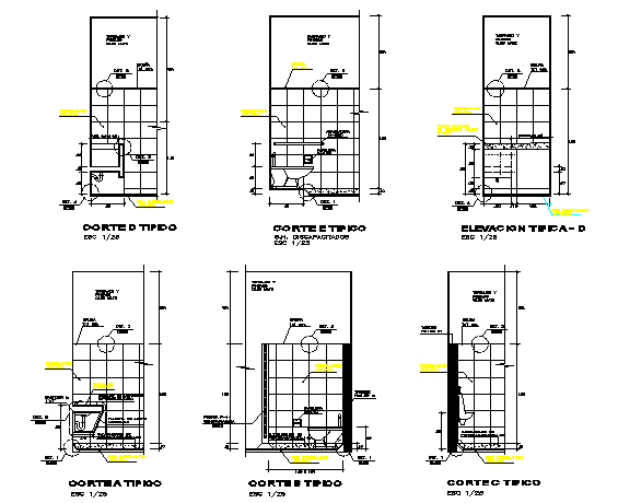 Bathroom elevation design dwg file, front sectional elevation of bathroom, wc details with text detailing