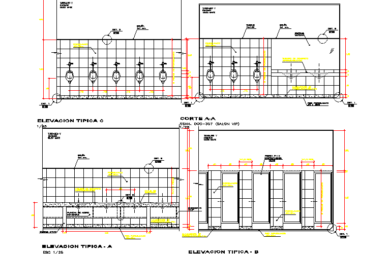 Sectional detail and elevation of a toilet dwg file, front details of mens toilet , with dimensions