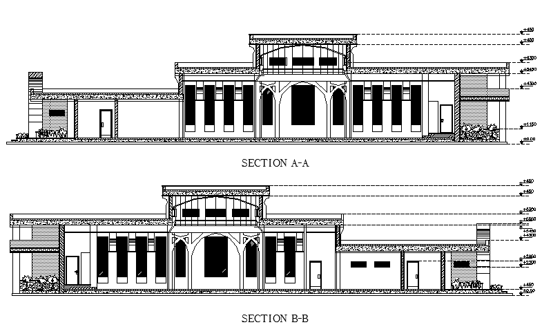Elevation design of a mosque, Front elevation and section detail dwg file, front elevation of a mosque is shown
