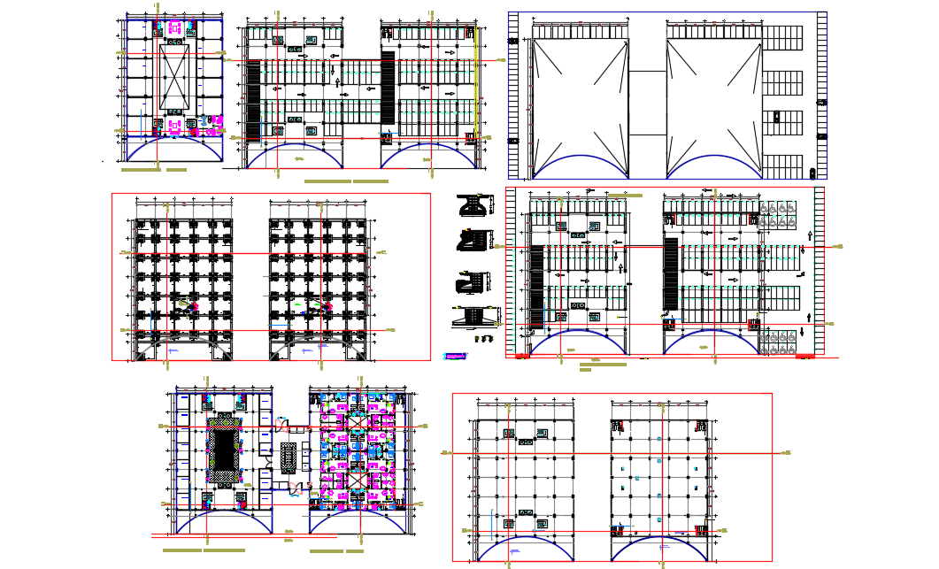 Find construction plan, structure plan, section plan, foundation plan and beam detail, the layout of all floor level and elevation design of Center hall project.