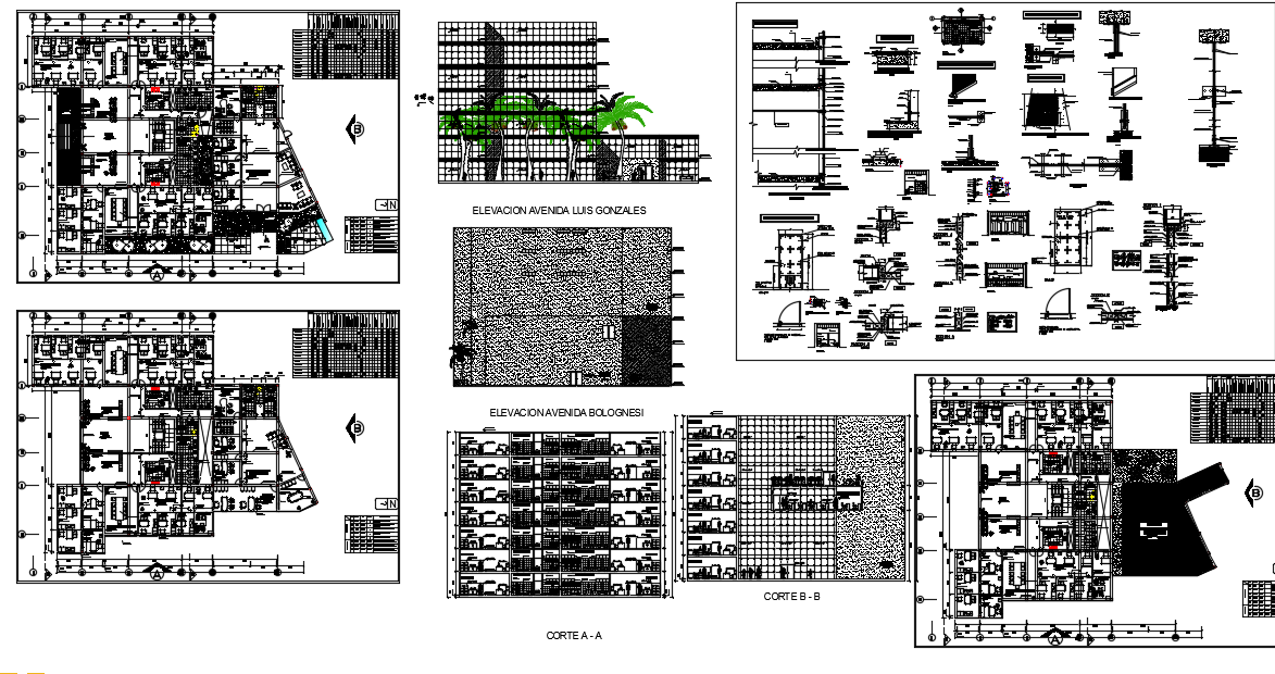 The architecture layout plan of all level floor along of furniture detailing, section plan, construction plan, structure plan and elevation design of the Business building.