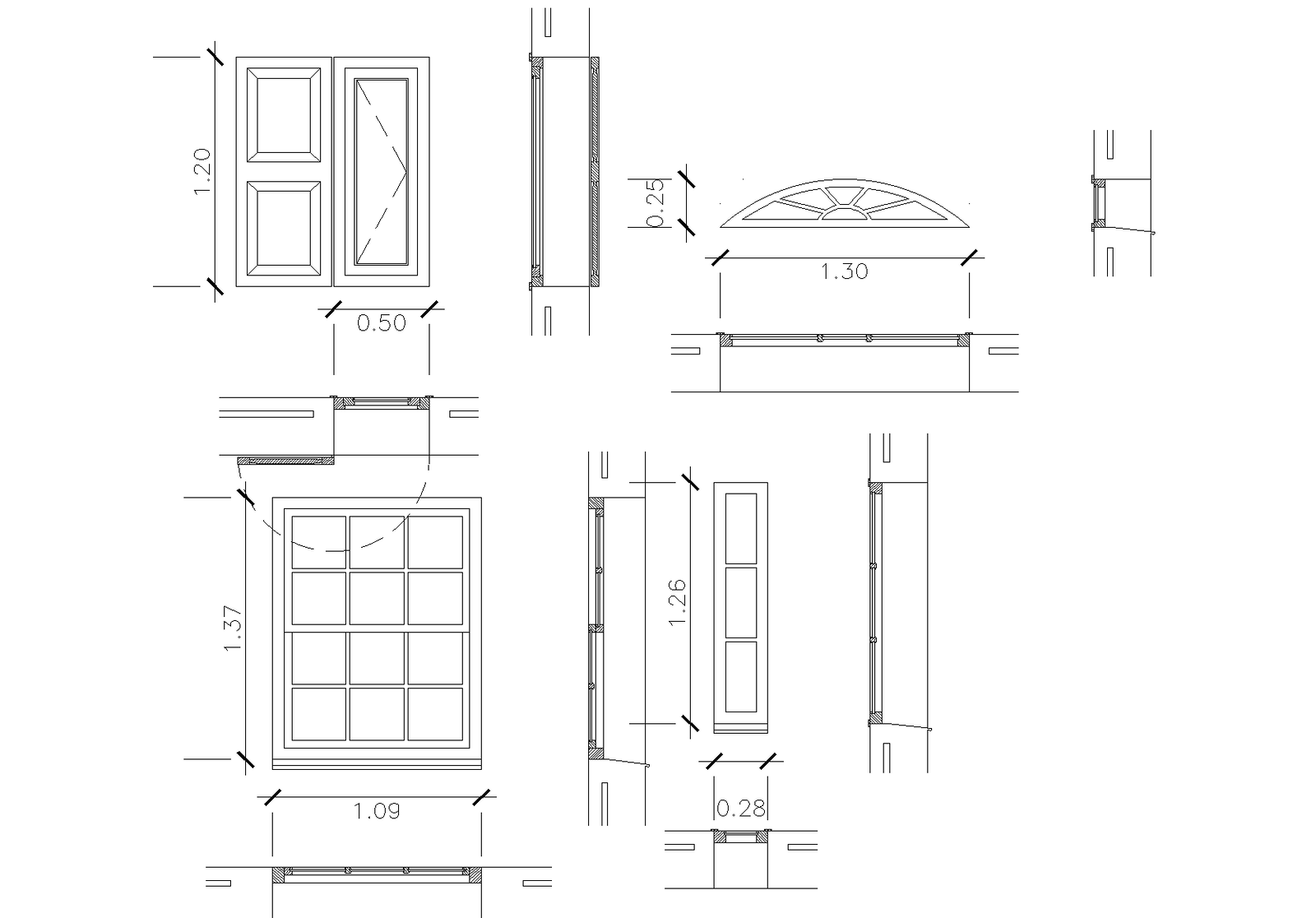 Window plan. Plan with sections and front plan in detail. Detailing of a window frame with dimension detail.