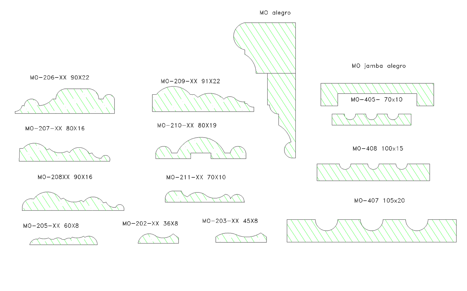 Section of wooden mouldings plan. Designer wooden moldings with different styles and dimensions. Detailing of dimension is shown in the plan.