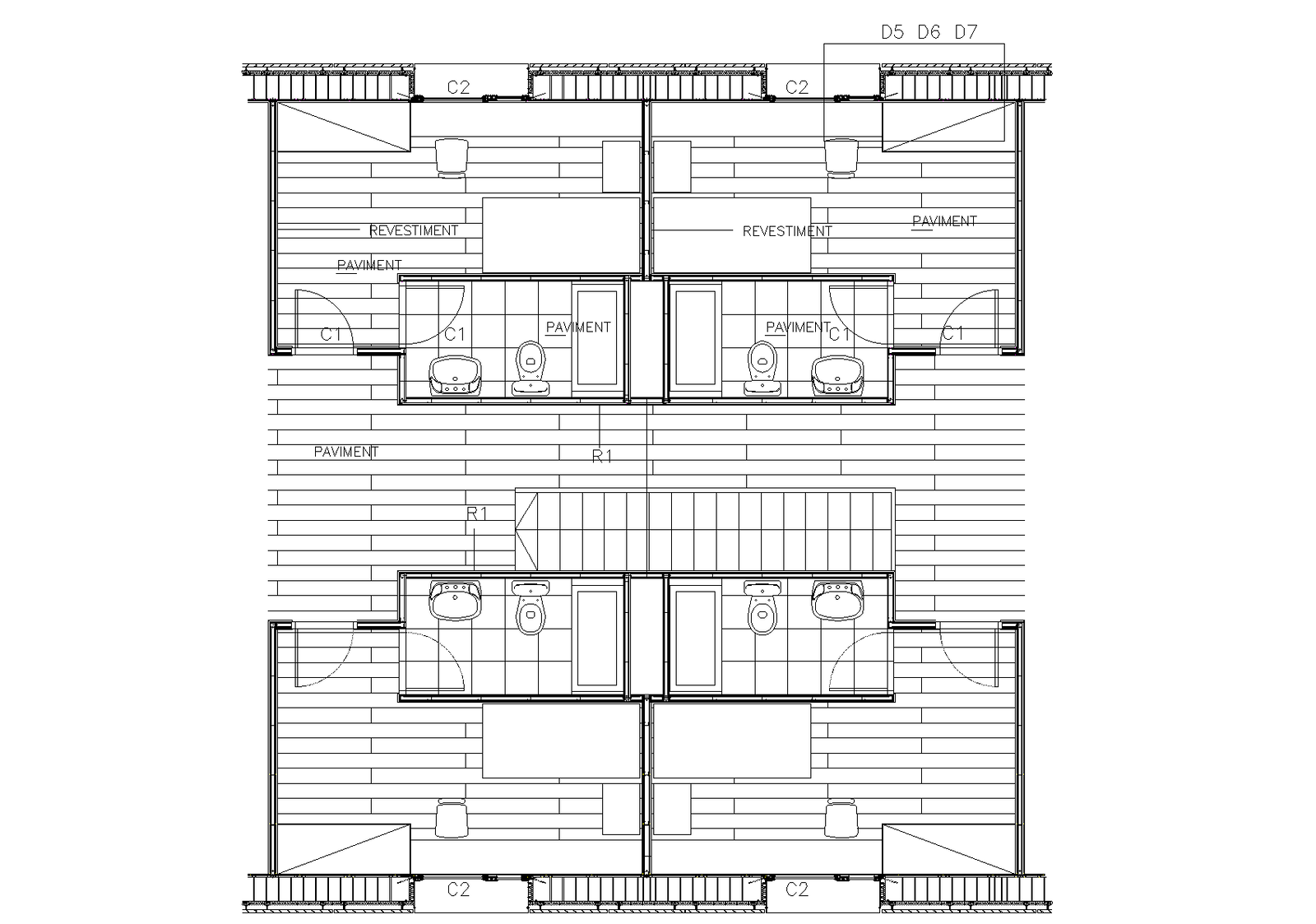 Constructive section plan. The top view plan of constructive plan with detailing of pavement, wash-basin, W.C, shower area, etc.,