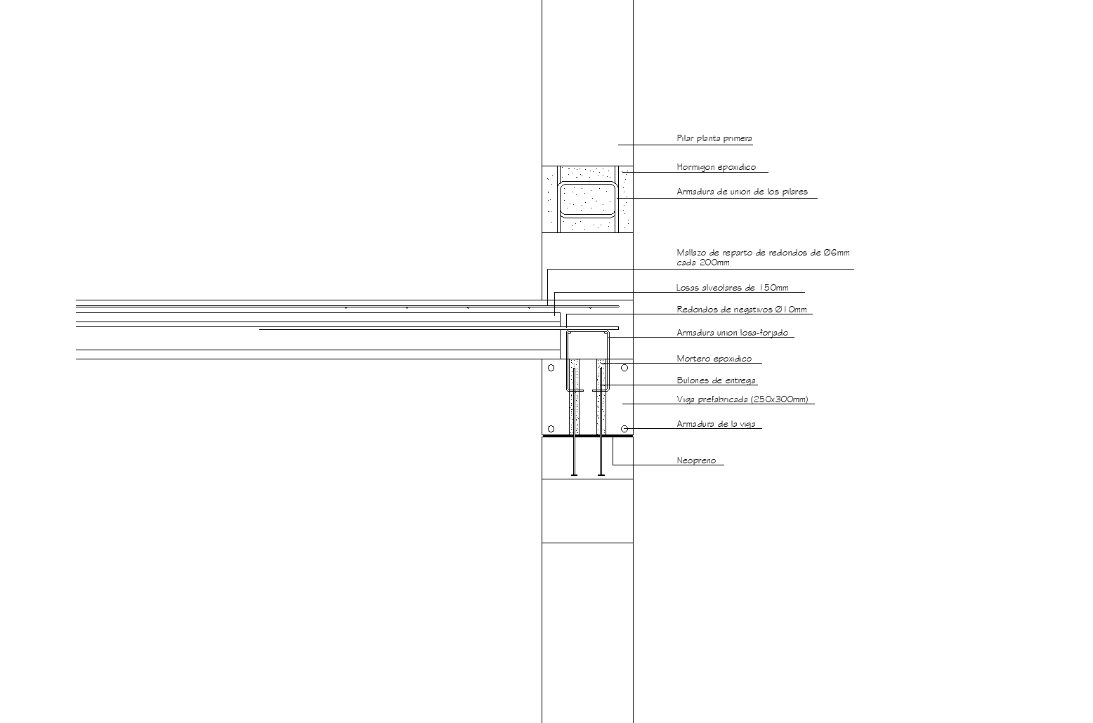 Section detail union beam-pillar-wrought-pre-cast façade plan. Detailing of slabs Alvares, epoxy concrete, etc.,