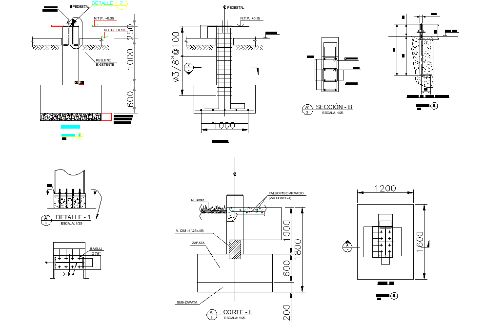 Footing section detail, reinforcement detail, dimension detail, naming detail, section line detail, scale 1:25 detail, etc.