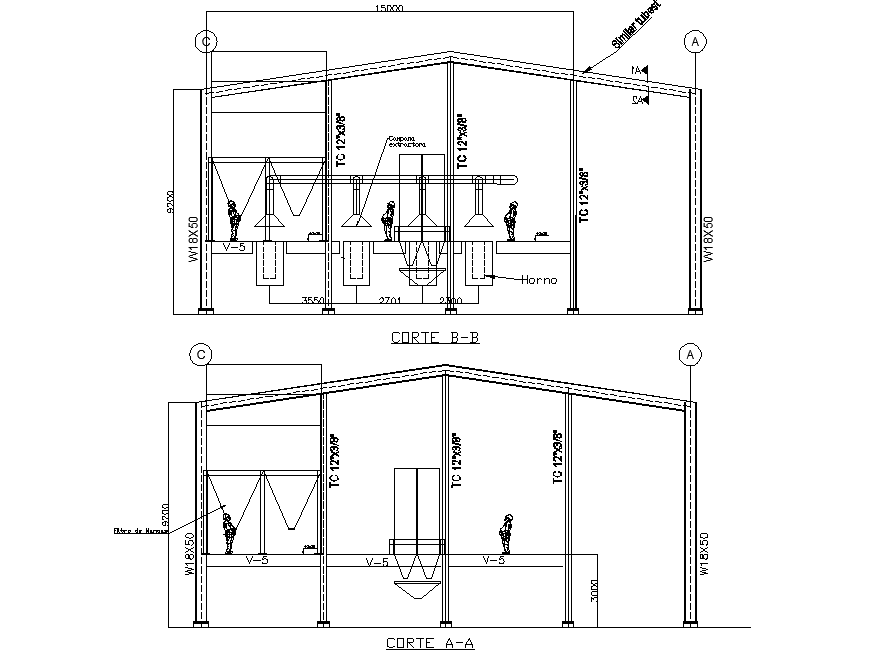 Section industrial warehouse mezzanine plan detail, centre line plan detail, dimension detail, section A-A’ detail, section B-B’ detail, hidden line detail, etc.