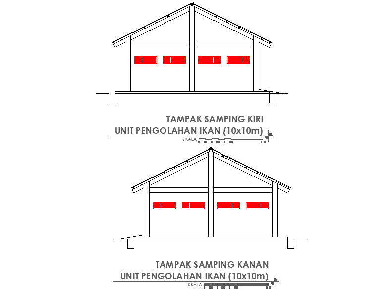 Left side and right side section Fish processing unit plan detail, leveling detail, window detail, roof plan detail, etc.