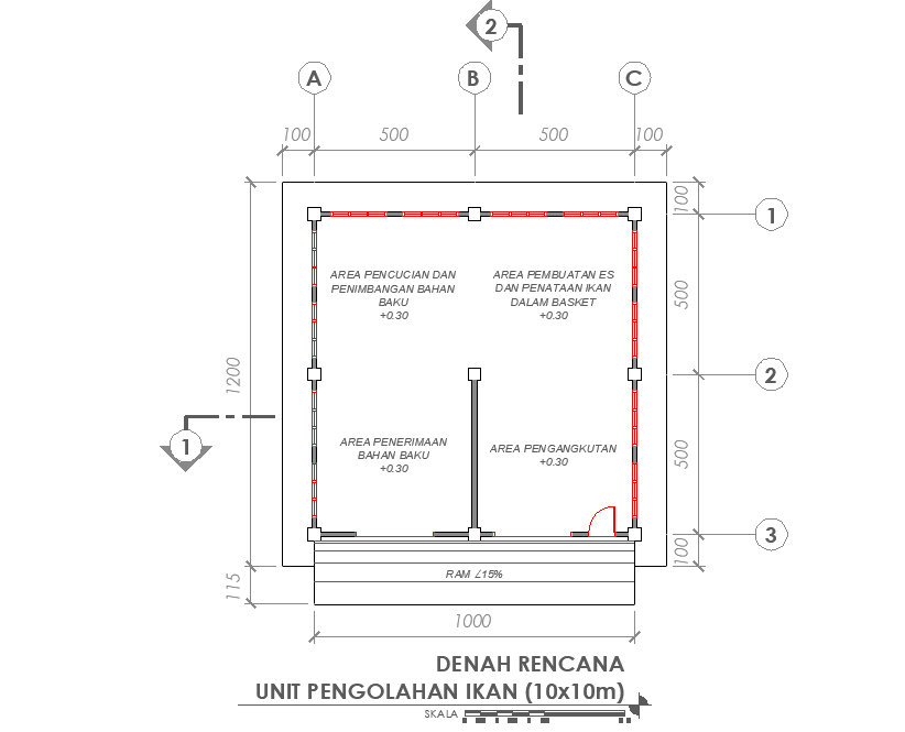 Fish processing unit plan detail, section line detail, dimension detail, naming detail, centre line detail, etc.
