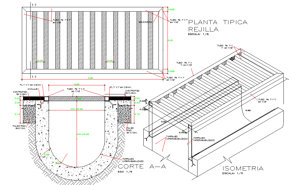 Typical plant grid detail, isometric view detail, dimension detail, naming detail, section A-A’ detail, etc.
