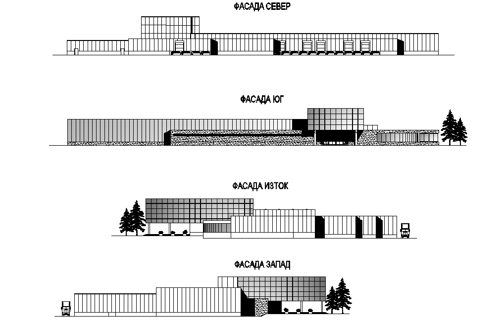 Elevation Multi functional factory plan detail, front elevation detail, right elevation detail, left elevation detail, back elevation detail, etc.