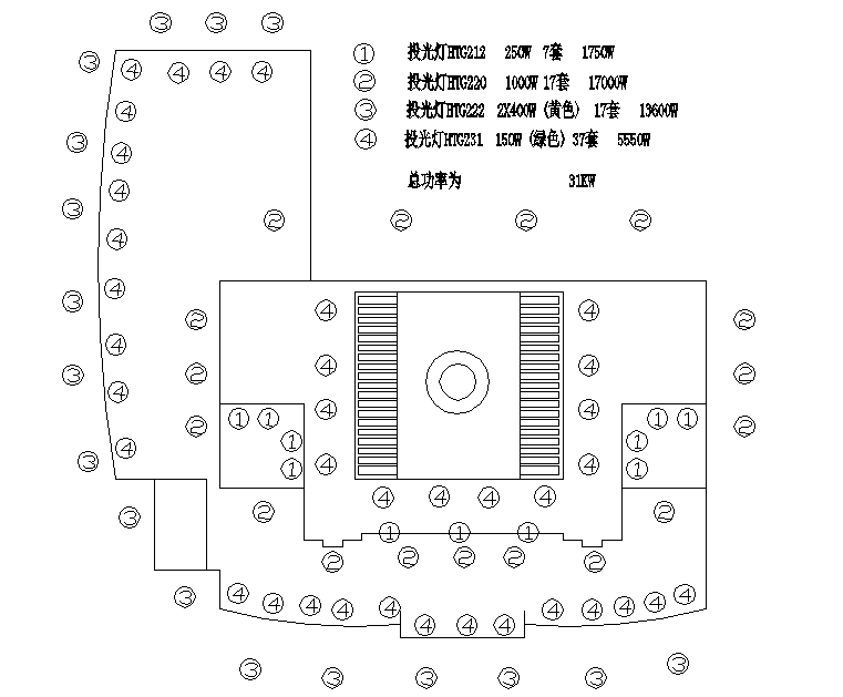 Spotlight HTG222 2X400W (yellow) 17 sets 13600W, Spotlight HTG231 150W (green) 37 sets 5550W etc.