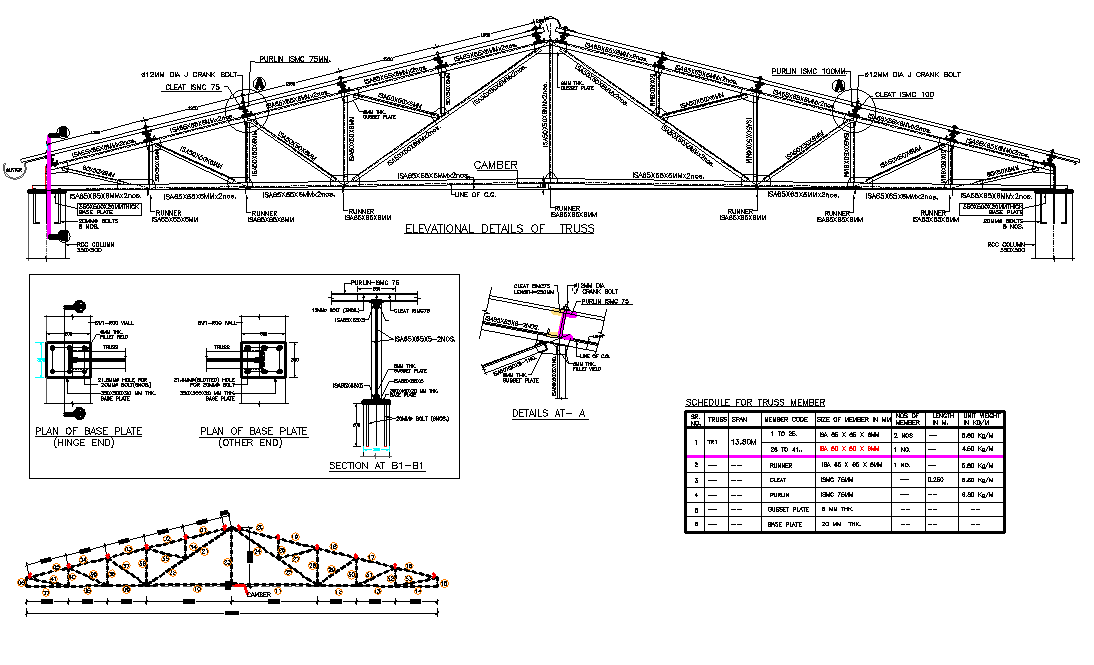 Structural Roof truss plan detail, dimension detail, naming detail, schedule for truss member detail, reinforcement detail, bolt nut detail, etc.