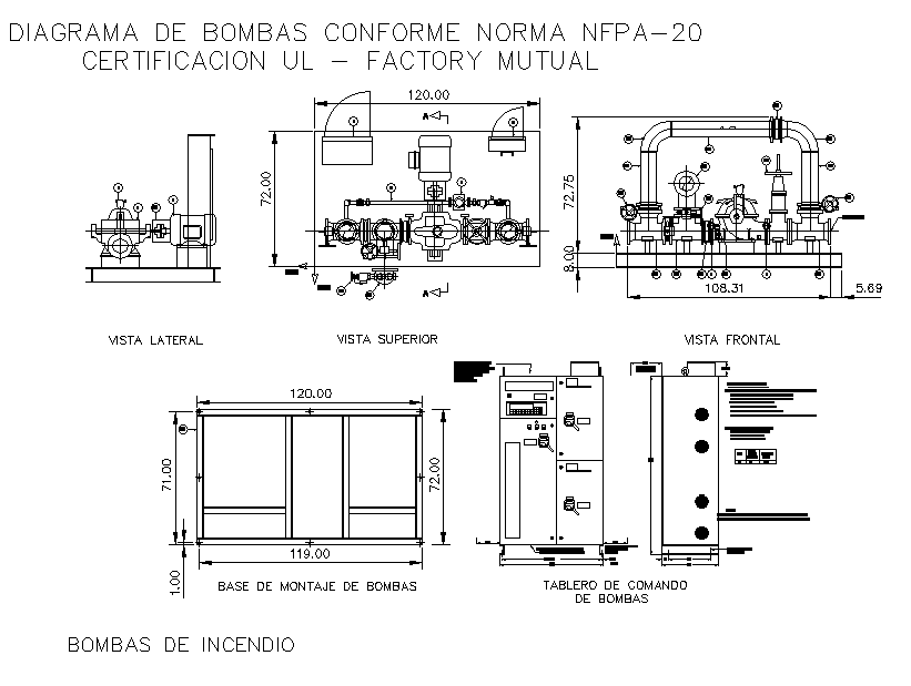 Fire pump plan and elevation detail, dimension detail, naming detail, numbering detail in naming detail, specification detail, etc.