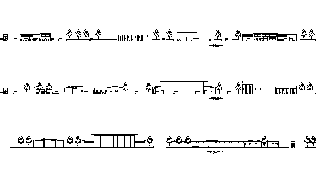 Technological innovation center plan detail, landscaping detail in tree and plant detail, front elevation detail, section 1-1 detail, section 2-2 detail, leveling detail, etc.