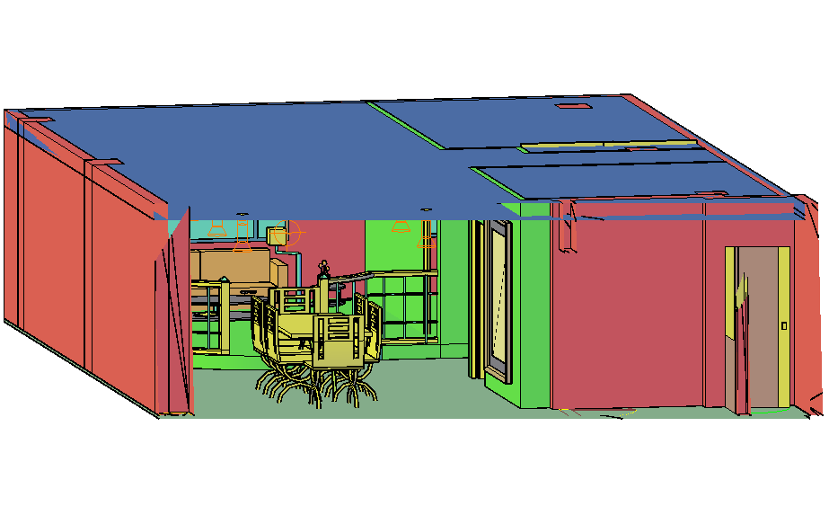 Apartment 3 d plan detail, front elevation detail, light detail, furniture detail in table, chair, door and window detail, etc.