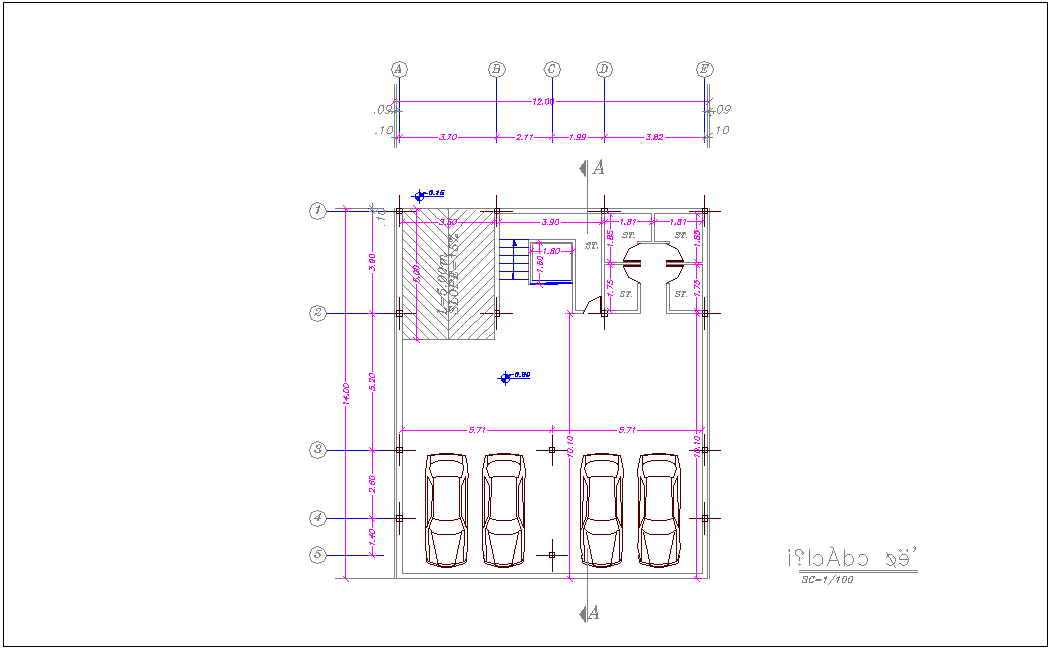 Basement floor plan of house dwg file in plan with view of house with distribution of area,wall and wall support view,parking area with necessary dimension.
