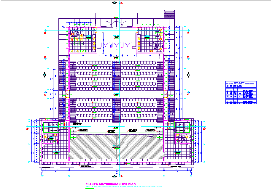 Auditorium view with first floor plan dwg file in plan with view of area distribution,stage view and view