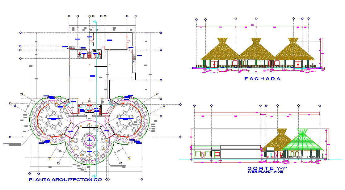 layout plan of all floor, bedrooms, restaurant, dining area, section plan elevation design, furniture plan and vehicle parking of Tourist Restaurant Design plan. Restaurant project DWG, Restaurant project Download file, Restaurant project Design
