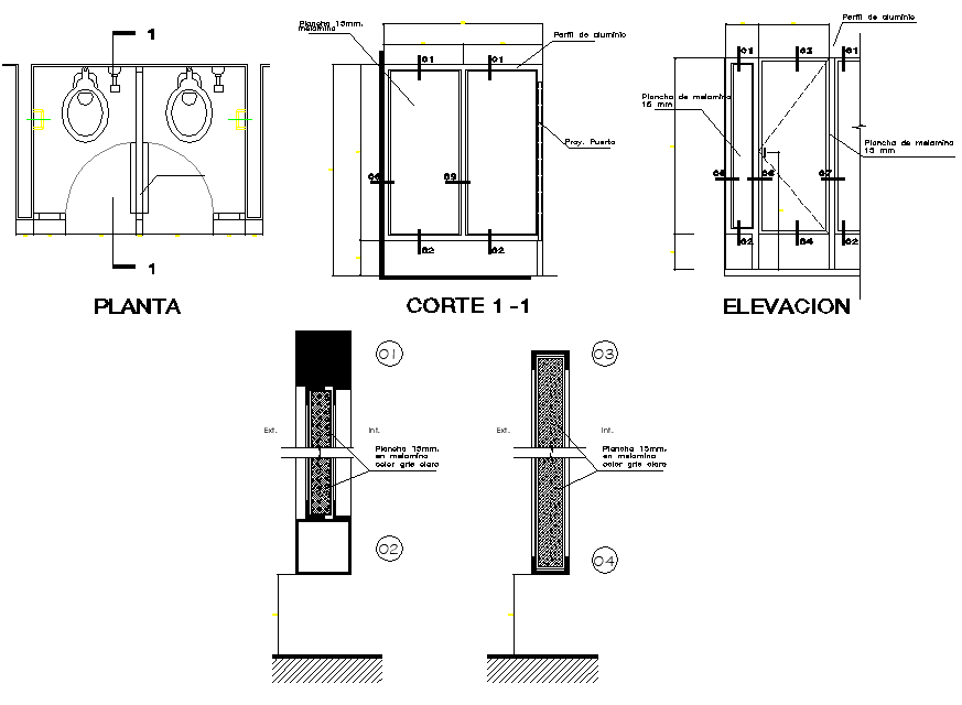 Door elevation and section detail, section line detail, toilet plan detail, naming detail, single door detail, water closed detail, dimension detail, etc.