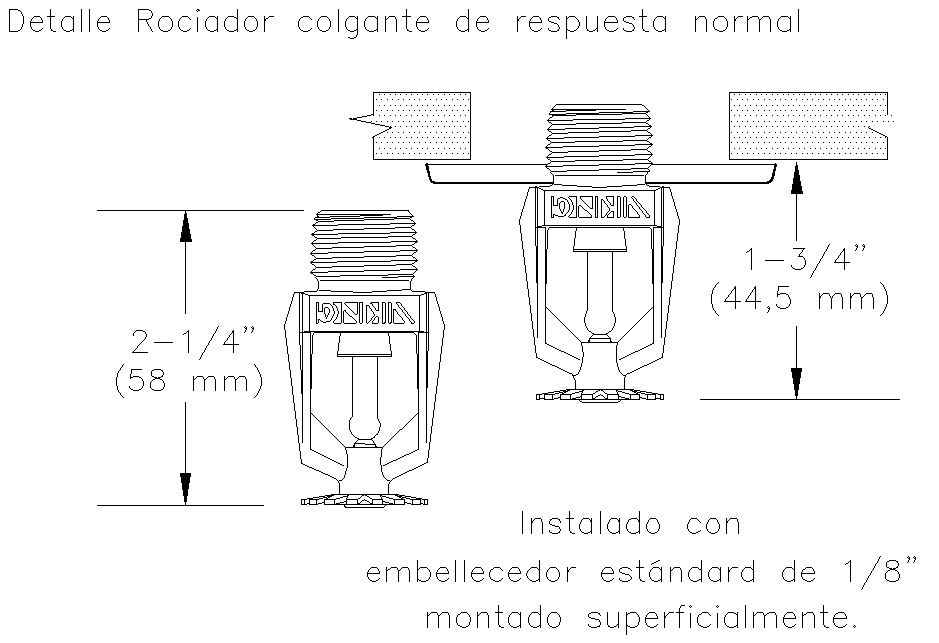 Sprinkler detail normal response pendant layout file, 58mm and 44.5mm height detail, dimension detail, naming detail, etc.