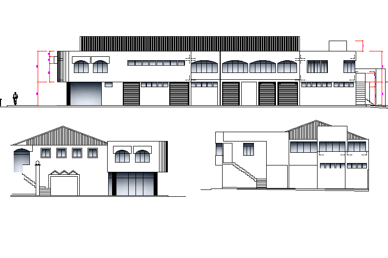 Elevation market plan dwg file, front elevation detail, right elevation detail, left elevation detail, dimension detail, furniture detail in door and window detail, roof detail, etc.