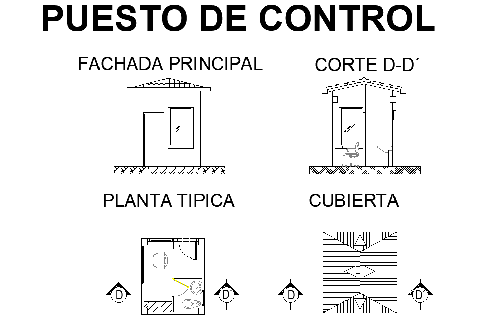 Check point cabin plan, elevation and section dwg file, planning anf roof plan detail, section D-D’ detail, front elevation detail, section line detail, etc.