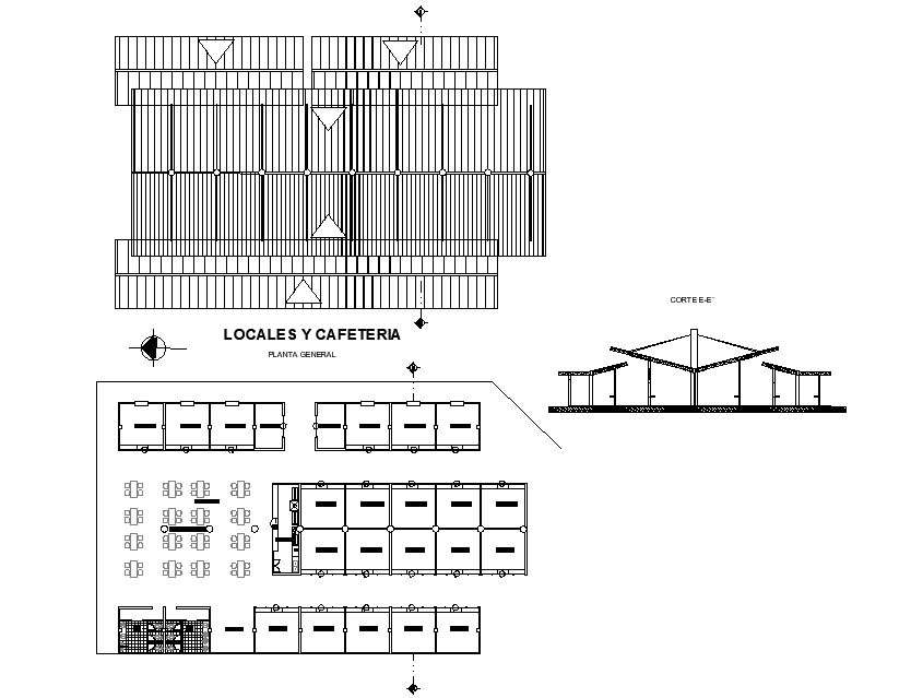 Cafe plan detail dwg file, roof plan detail, section line detail, naming detail, north direction detail, section detail, etc.