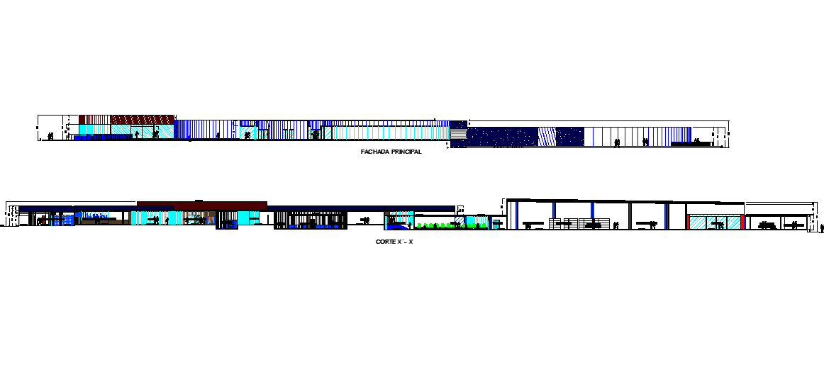 Elevation and section office autocad file, front elevation detail, section X-X’ detail, landscaping detail in tree and plant detail, hatching detail, etc.