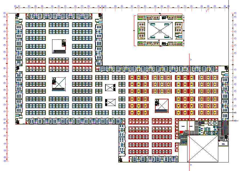 Retail market layout plot detail, centre lien plan detail, dimension detail, cut out detail, section lien detail, furniture detail in table, chair, door and window detail, etc.