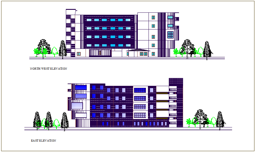 North west and east elevation view of school of architecture dwg file in north east elevation with tree view in both end and floor view with brick and balcony view, wall with wall support view and main entry way with east elevation view.