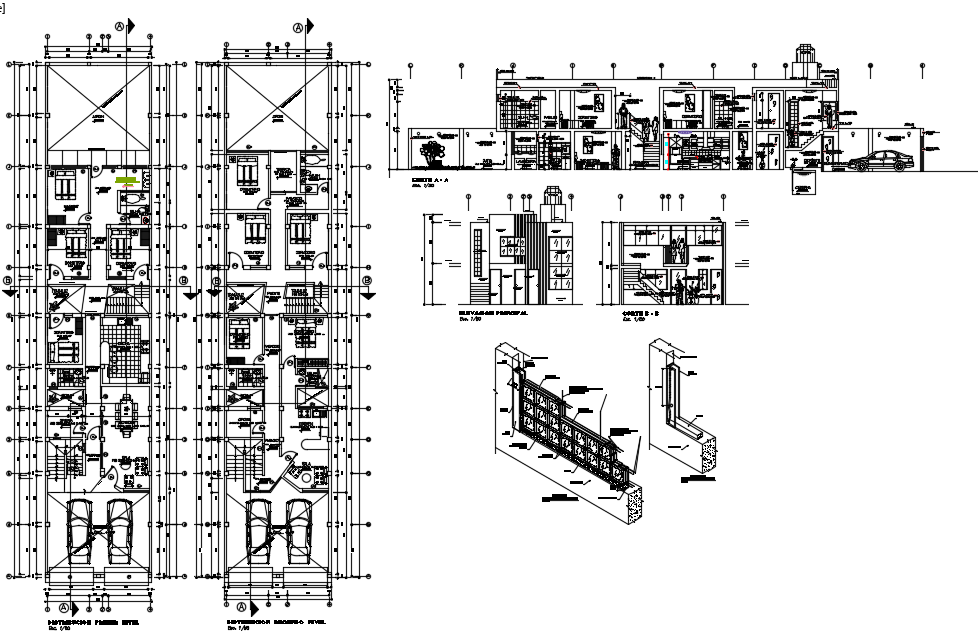 The Architecture Design of multi-family housing dwg file. With kitchen, bedroom, drawing room, toilet and detail of curvature shaped door, car parking in AutoCAD format.