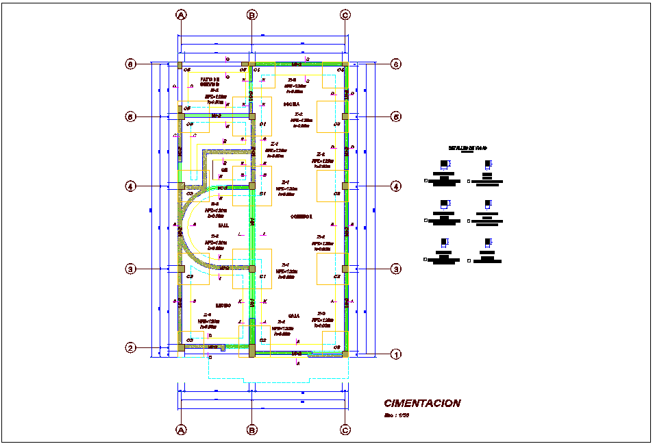 Foundation plan with column detail with construction view for house dwg file in foundation plan with view of area view,wall and column view and different types of section view with necessary dimension in plan.