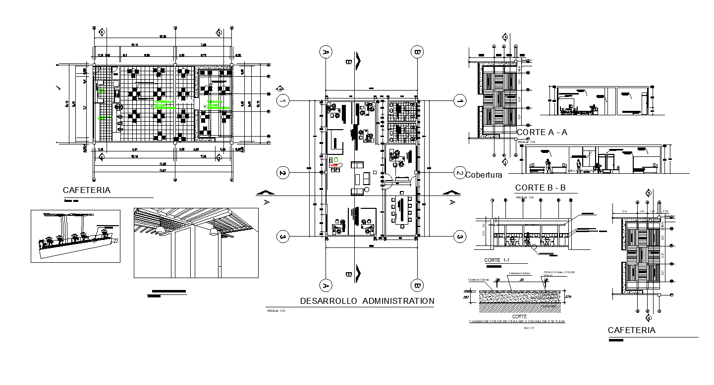 Offices-cafeteria dwg file. With dimension detail, naming detail, wall section, area table, furniture design etc.