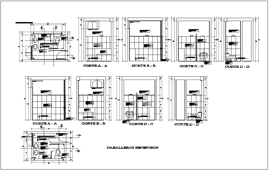 Plan with different axis section view of knight reception for administration building dwg file in plan with view of reception area with washing area view and view of different axis section view with reception area and washing area with main dimension.