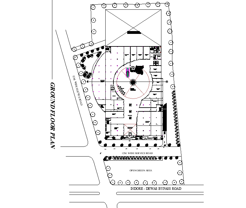 Shopping mall layout file, landscaping detail in tree and plant, cut out detail, car parking detail, ground floor detail, section line detail, naming detail, etc.