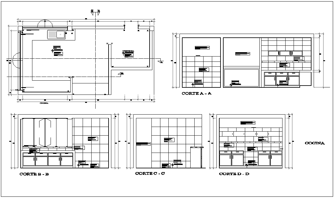 Kitchen plan with different axis section view for admin area with architectural view dwg file