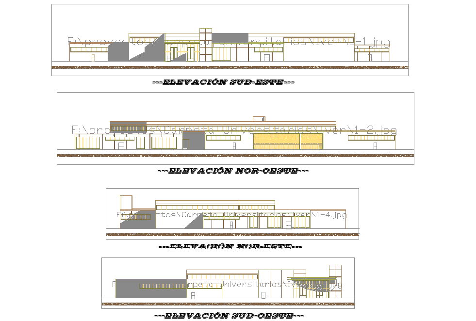 Detail of elevation shopping mall dwg file, front elevation detail, left elevation detail, right elevation detail, back elevation detail, etc.