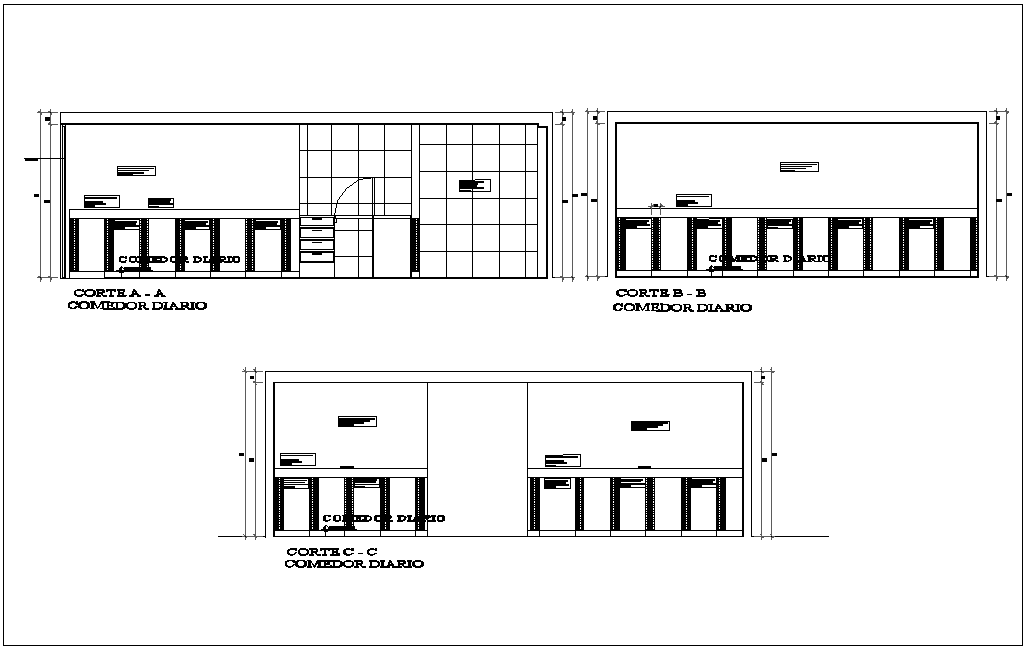 Different axis section view of dining room for corporate building dwg file in elevation with view of