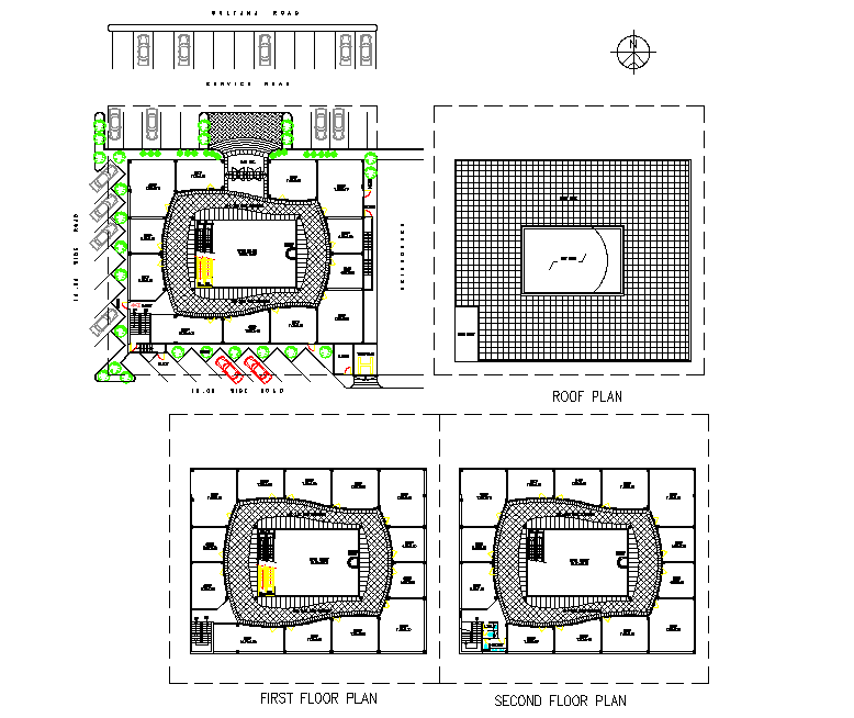 North direction Planing mall detail, basement car parking detail, landscaping detail in tree and plant detail, hatching detail, hidden line detail, stair detail, naming detail, etc.