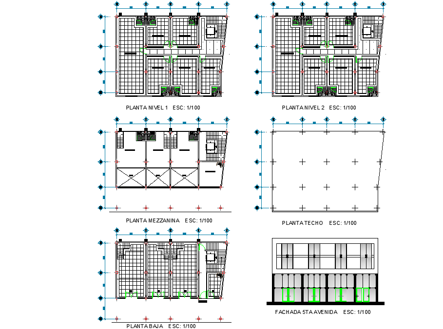 Mini shopping center plan dwg file, front elevation detail, hatching detail, centre line detail, dimension detail, naming detail, scale 1:100 detail, stair detail, toilet detail, etc.