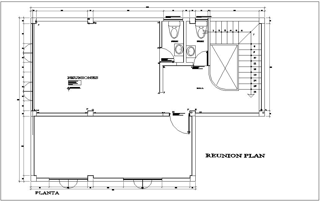 Corporate building reunion plan with architectural view dwg file in plan with view of distribution of area and wall view,door view,reunion area,washing area view for admin area view with necessary