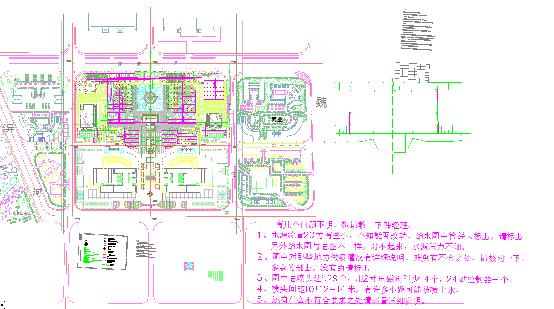 Residential Town Planing Lay-out Plan Detail In the picture, there is no detailed description of sprinkler irrigation in those places. It is inevitable that there are some discrepancies. Please check it. The total number of nozzles in the figure is 529, with 2 solenoid valves at least 24, and 24 station controllers.