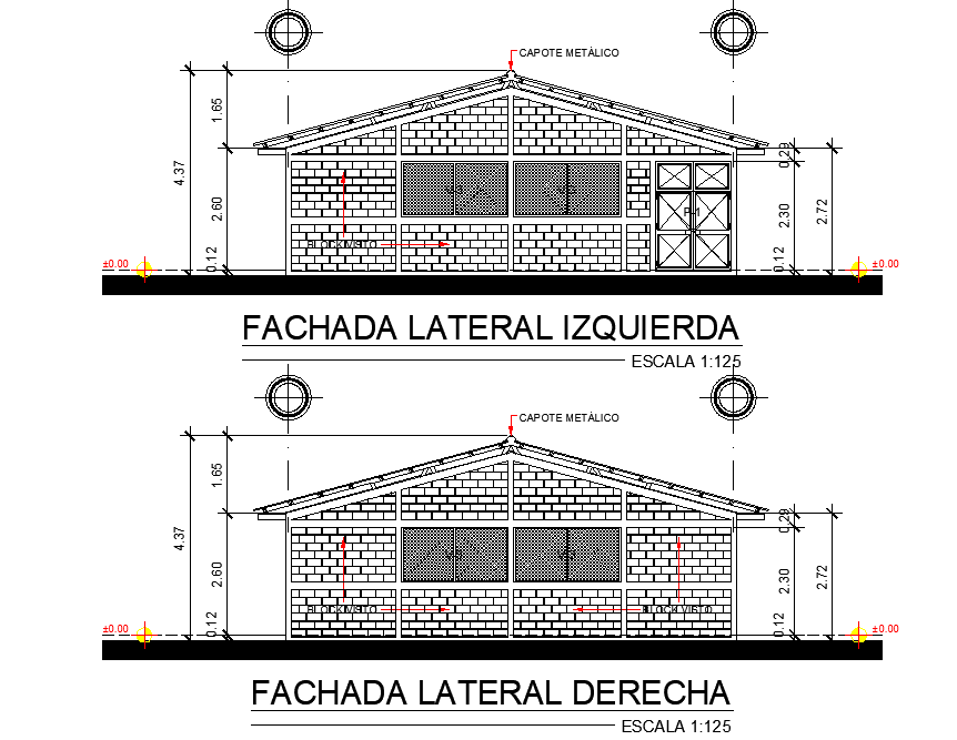 Elevation rural community market layout file, left side elevation detail, right side elevation detail, leveling detail, dimension detail, brick wall detail, scale 1:125 detail, etc.