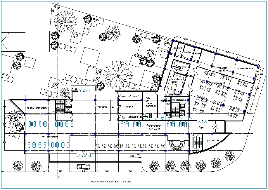Floor plan of hotel dwg file in plan with view of area distribution and view of wall area,dining area and restaurant view,dining area,washing area view and hall view,reception area with necessary detail view and dimension.