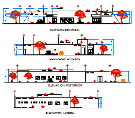 Here the Elevation design drawing of Clinic design drawing with main faced elevation, lateral elevation design, posterior elevation design drawing in this auto cad file.